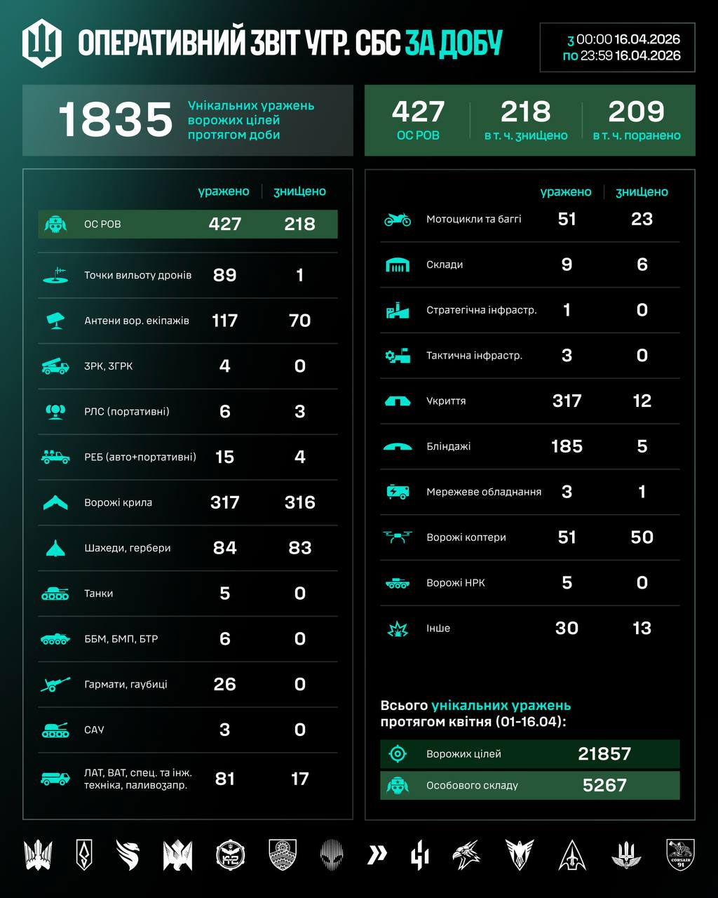 З пачатку красавіка падраздзяленнямі СБС паражана 21857 мэтаў праціўніка, з іх 5267 — асабовы склад.
