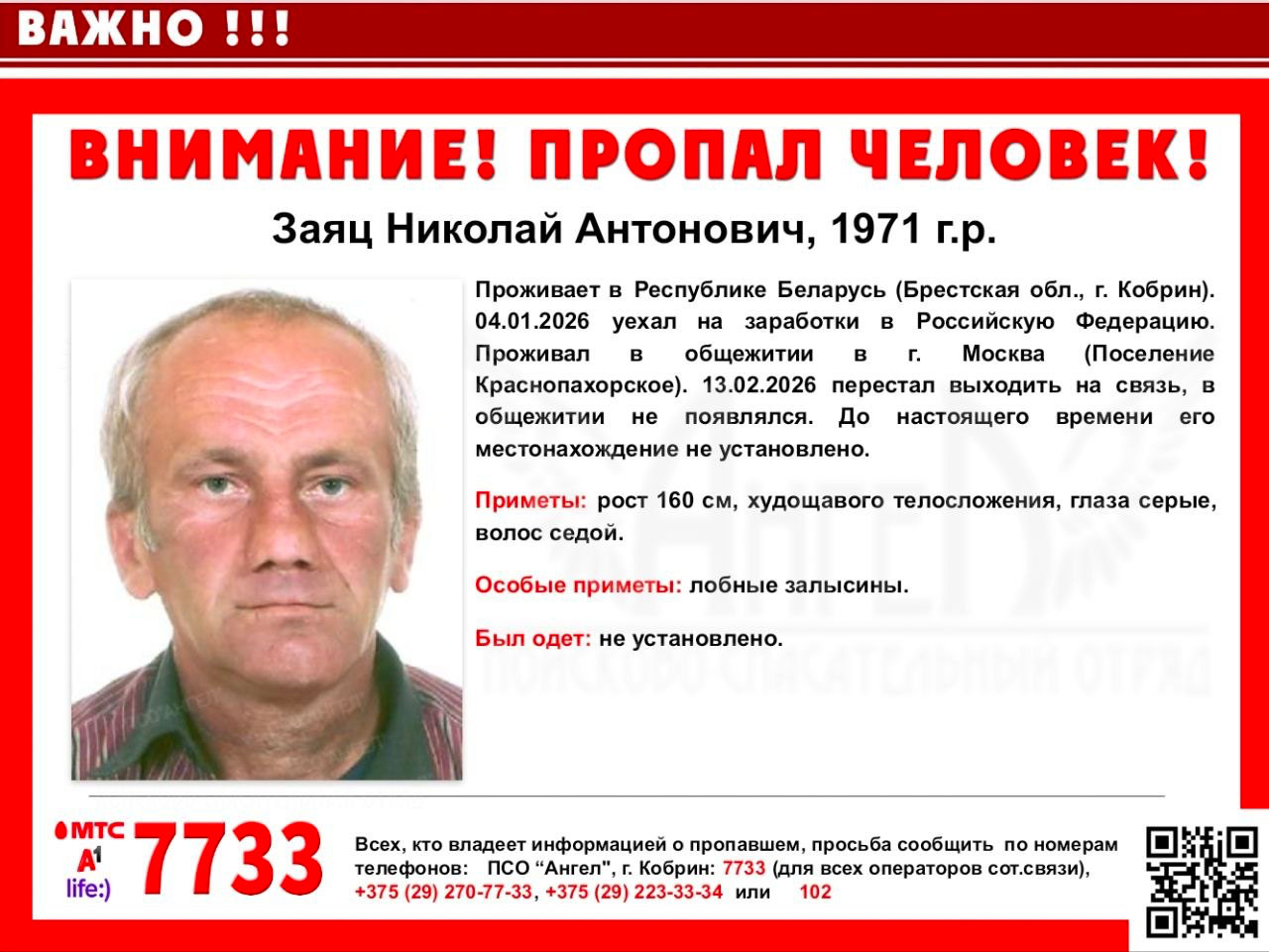 Беларус Мікалай Заяц, які паехаў на заробкі ў Расію, знік у Маскве. Пра гэта паведаміў пошукава-выратавальны атрад «Ангел».