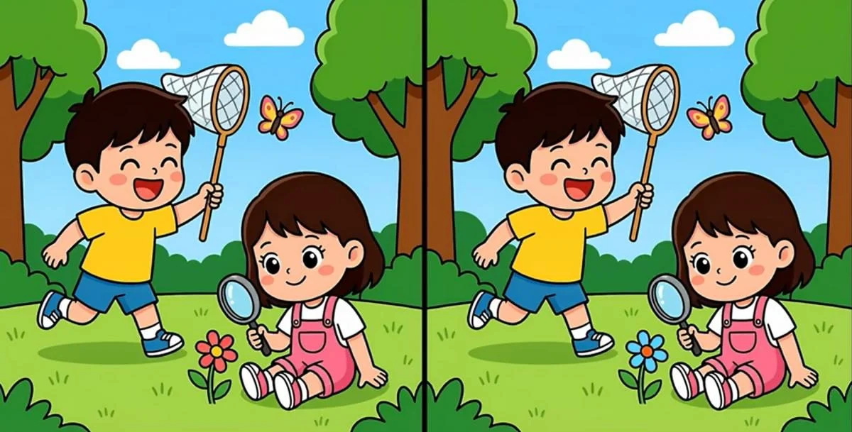 Перад вамі два малюнкі з дзецьмі ў парку. На першы погляд яны выглядаюць аднолькава, але гэта не так — паміж імі ёсць тры адрозненні.