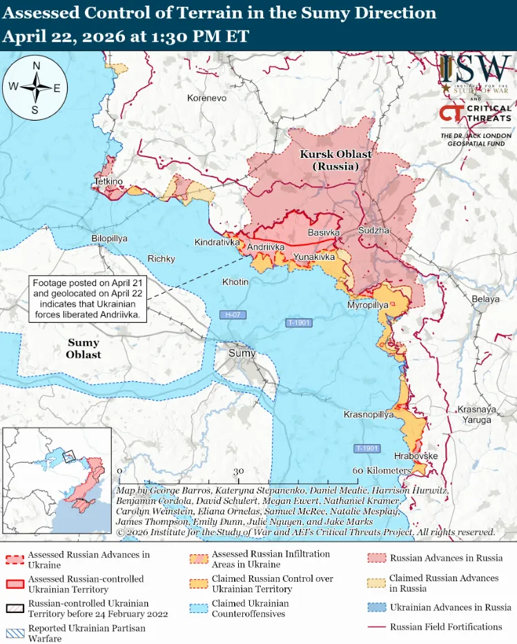 Апублікаваныя 21 красавіка відэазапісы з геалакацыяй паказваюць, што ўкраінскія войскі займаюць пазіцыі ў паўночнай Андрэеўцы (на поўнач ад горада Сумы). Паводле даных аналітыкаў ISW, украінскія вайскоўцы, верагодна, вызвалілі Андрэеўку.