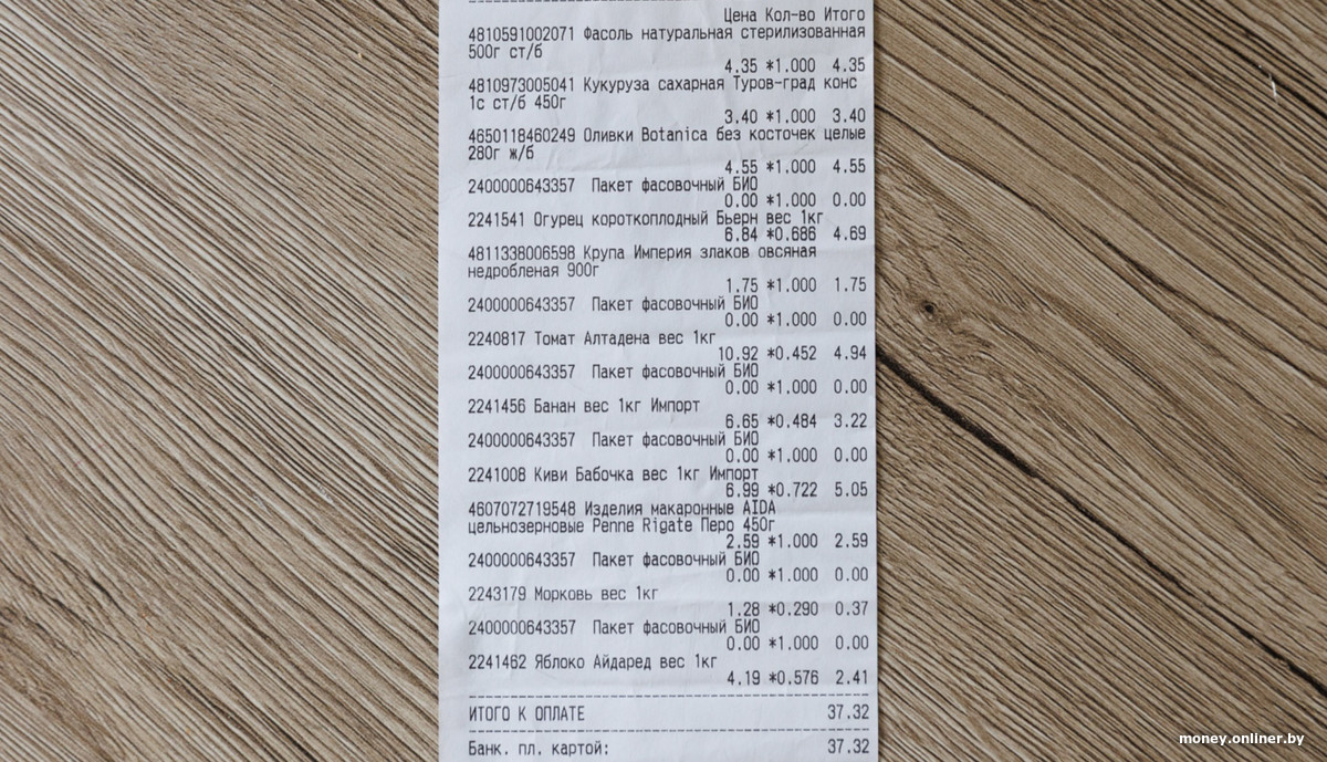 Вось, напрыклад, адна з маіх закупак на тыдзень — яна абышлася ў 37 рублёў. Там былі фасоля, кукуруза, алівы, агуркі, памідоры, бананы, ківі, яблыкі, морква, аўсянка, макароны. Гэта якраз той набор, з якога я збіраю свой рацыён.