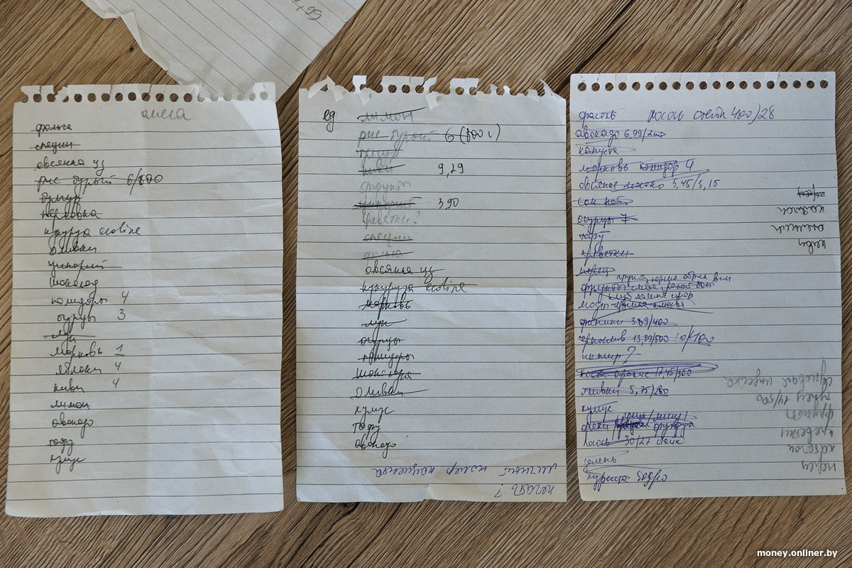Перад паходам у краму я заўсёды раблю рэвізію дома, гляджу, што ў мяне ёсць у халадзільніку, якія крупы засталіся, што скончылася. У мяне дрэнная памяць, таму, калі я не запішу, я проста забудуся і, напрыклад, вярнуся без памідораў на ўвесь тыдзень.