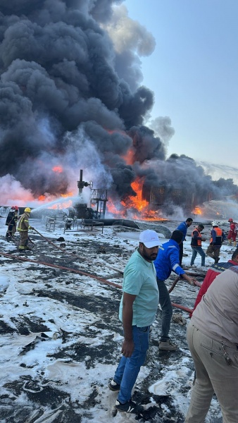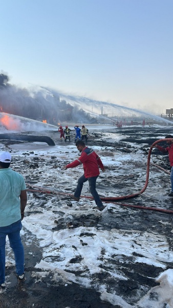 Video posted on social media shows the area engulfed in flames and thick black smoke. Firefighters in protective gear fought the blaze, using white foam to cover the scene.