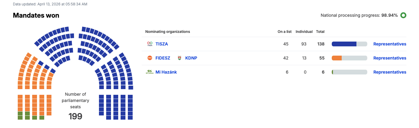 In the Hungarian parliamentary elections, after 98.94% of votes were counted, the Tisza party of Peter Magyar wins with 138 seats in parliament, while the Fidesz party of Viktor Orbán wins 55 seats.