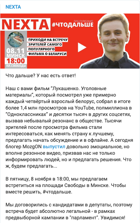 Мы договорились с кандидатами в депутаты, поэтому встреча будет абсолютно легальной - в рамках предвыборной кампании в «парламент». Увидимся!», - написал NEXTA в своем телеграмм-канале.