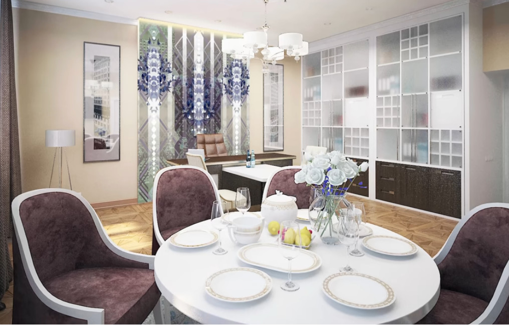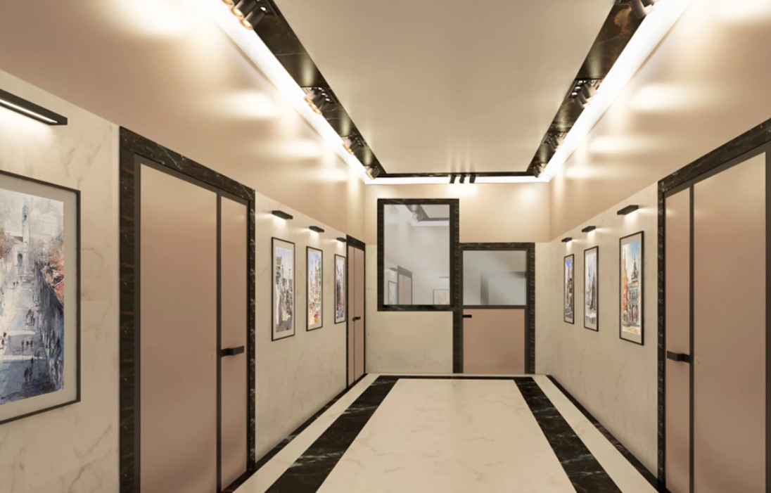 Интерьер блока выдержан в классическом стиле: текстильные обои, паркет, молдинги, картины и декоративные композиции в коридорах, чугунные перила с позолотой, мраморная плитка.
