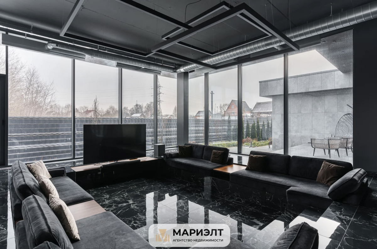 Гостиная выглядит своеобразно: стеклянная комната с панорамными окнами и диваны по периметру. Представьте, как классно будет большой семье собираться здесь по вечерам, проводить семейный нетворкинг и смотреть сериальчики.