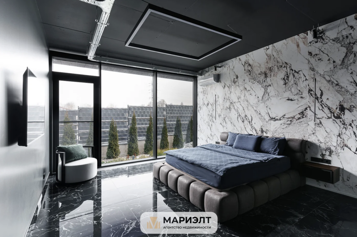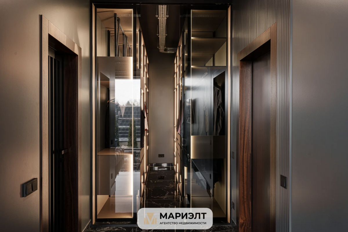 Мастер-спальня граничит со стильной деревянно-стеклянной гардеробной. Интересно, что абсолютно все полы в доме мраморные — к этому материалу владельцы явно неровно дышали.