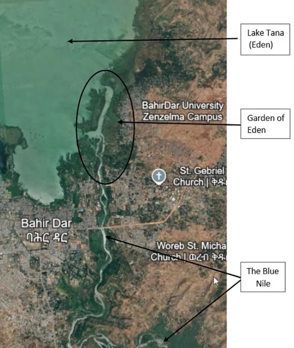 На основе таких географических подробностей, которые были описаны в Библии, ученые предполагают, что поскольку Тигр и Евфрат протекают на территории современного Ирака, то Эдем должен находиться где-то в том регионе. Но Махмуд Джаваид выдвинул другую теорию, он говорит, что Эдем мог находиться в Бахр-Даре. Это плодородный регион на северо-западе Эфиопии, он располагается рядом с южным побережьем озера Тана, откуда берет свое начало Голубой Нил.