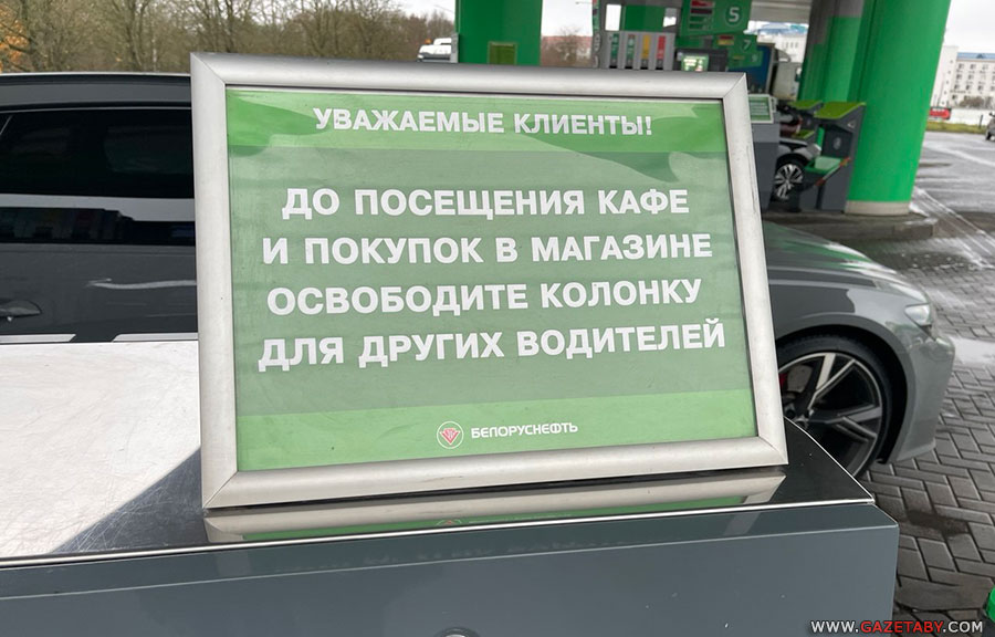 На заправках «Белоруснефть» на колонках рядом с заправочными пистолетами появились плакаты: «Уважаемые клиенты! До посещения кафе и покупок в магазине освободите колонку для других водителей». На заправках «А-100», «Лукойл», «Юнайтед компани» таких плакатов не замечено.