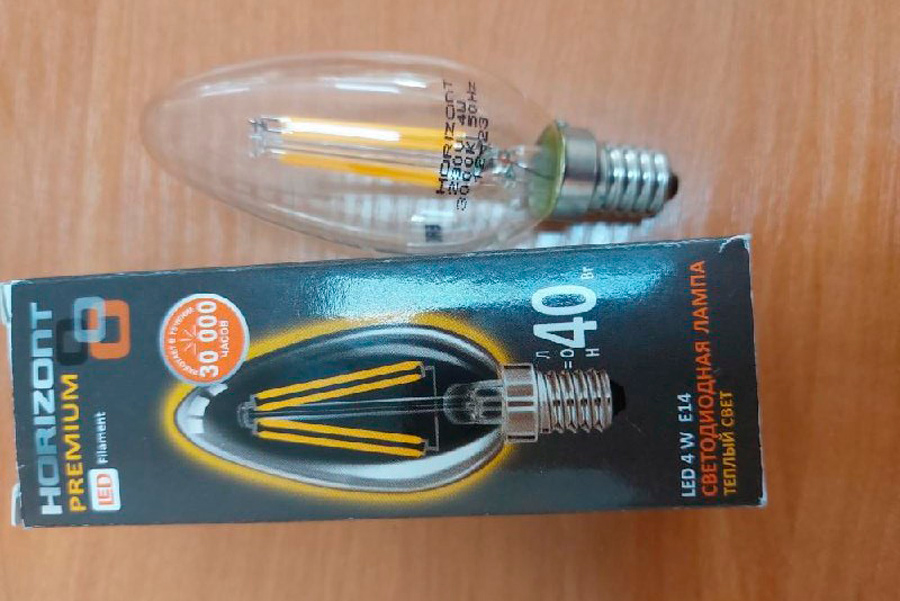Речь идет о светодиодной лампе торговой марки Horizont LED-F C37 4W 3000K E14.