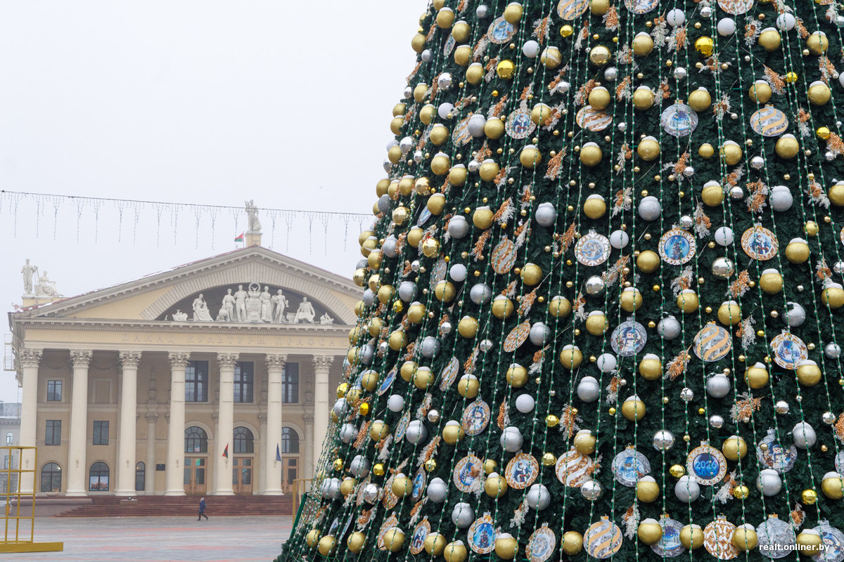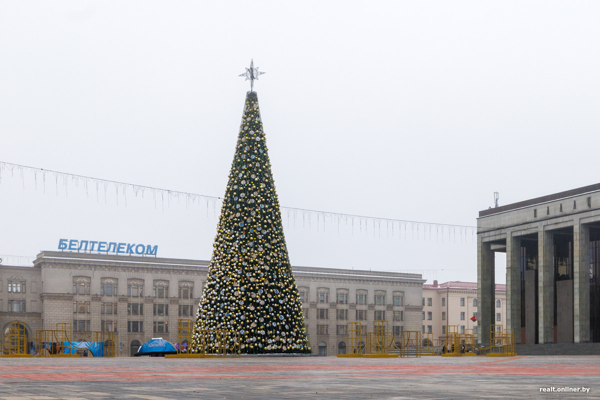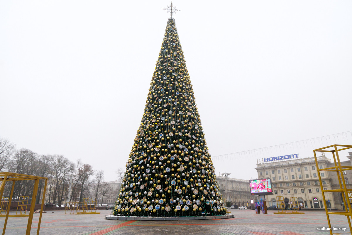 В Минске, на Октябрьской площади, завершилась установка главной елки страны. Символ Нового года уже полностью готов к предстоящим праздникам: на макушке — звезда, на ветках — гирлянды и игрушки в классической цветовой гамме: есть белые, синие и золотистые шарики, пишет Onlíner.