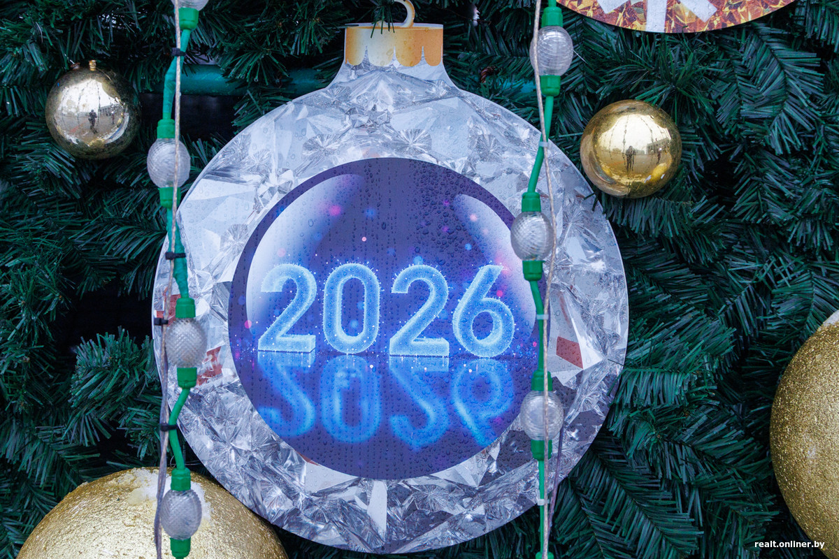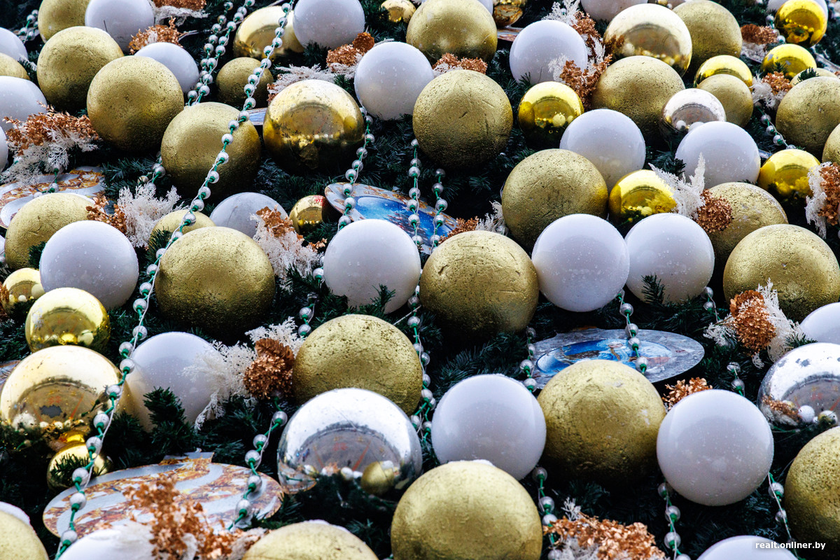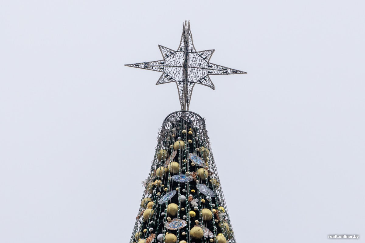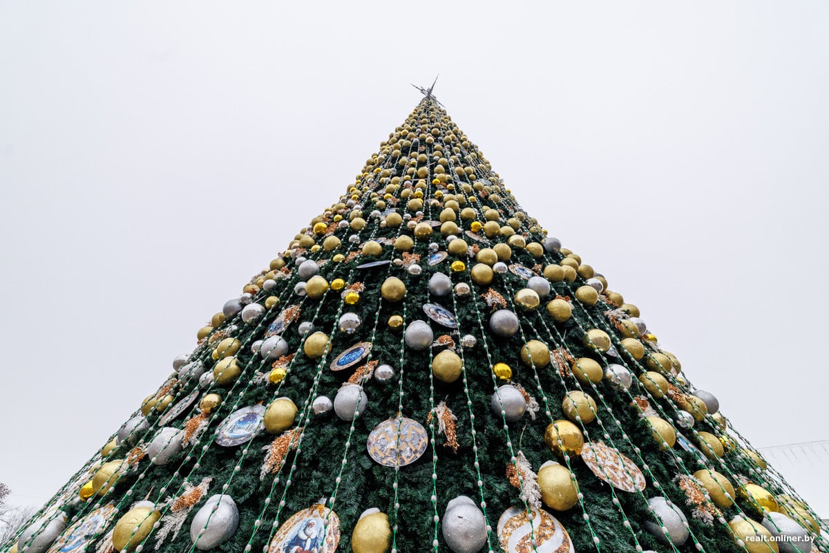 В Минске, на Октябрьской площади, завершилась установка главной елки страны. Символ Нового года уже полностью готов к предстоящим праздникам: на макушке — звезда, на ветках — гирлянды и игрушки в классической цветовой гамме: есть белые, синие и золотистые шарики, пишет Onlíner.