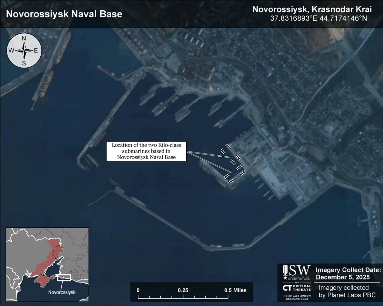 Спутниковые снимки Planet Labs, сделанные 5 декабря, показывают, что по состоянию на этот день на Новороссийской военно-морской базе находились две подводные лодки класса «Кило», а снимки с более низким разрешением, сделанные 11 декабря, указывают на то, что на базе находилась как минимум одна подводная лодка класса «Кило».