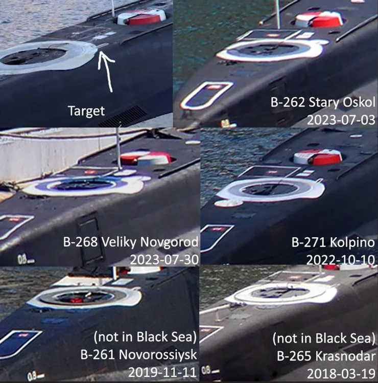 Исследователь сравнил конфигурацию пятен краски на корпусе на кормовом люке и установил, что россияне могли показать либо Б-271 «Колпино», либо Б-261 «Новороссийск», либо Б-265 «Краснодар». При этом последние две лодки — не в Черном море. Учитывая эти соображения, Duke BG сделал вывод, что в Новороссийске дроны СБУ поразили «Колпино».