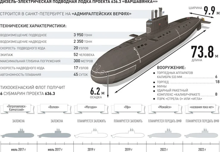 Б-271 «Колпино» — дизель-электрическая подводная лодка проекта 636.3 «Варшавянка» (Kilo), которую спустили на воду в 2016 году в Санкт-Петербурге. Лодка имеет экипаж из 50 человек, может развивать скорость около 30 км/ч и способна запустить четыре крылатых ракеты «Калибр». «Варшавянки» называют «черными дырами», поскольку они движутся почти бесшумно и их трудно засечь сонарами. Характеристики субмарин этого проекта — длина около 74 м, ширина 9 м, глубина погружения до 350 м.