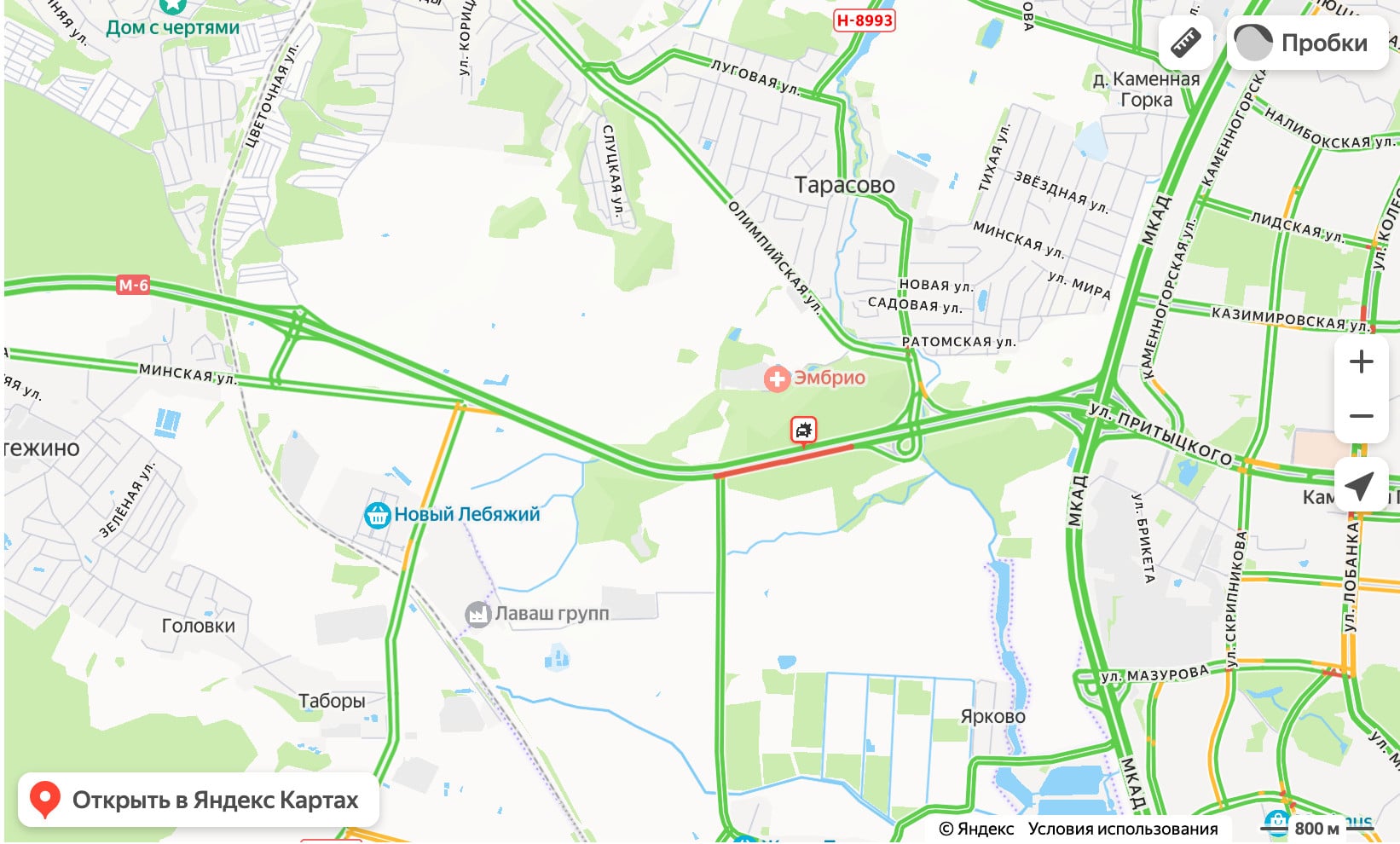Судя по карте, ДТП случилось буквально в нескольких километрах от МКАД, вблизи Тарасово. На записи видно: один автомобиль на крыше, еще один — за пределами проезжей части.