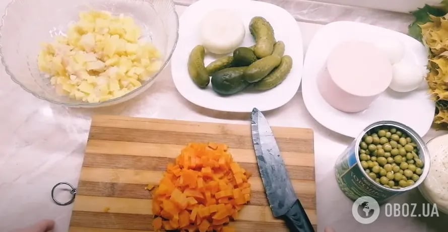 2. Три отварных морковки нарезать кубиком.