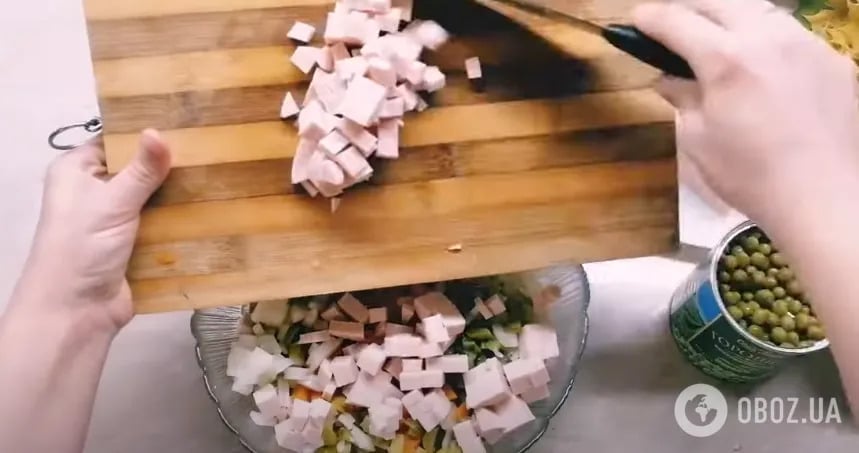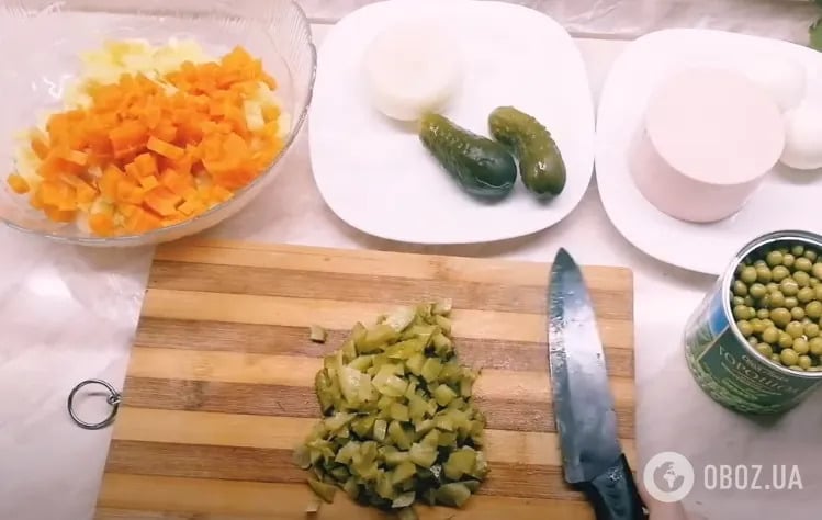 3. Шесть консервированных огурцов (можно в сочетании со свежими) порезать кубиком.