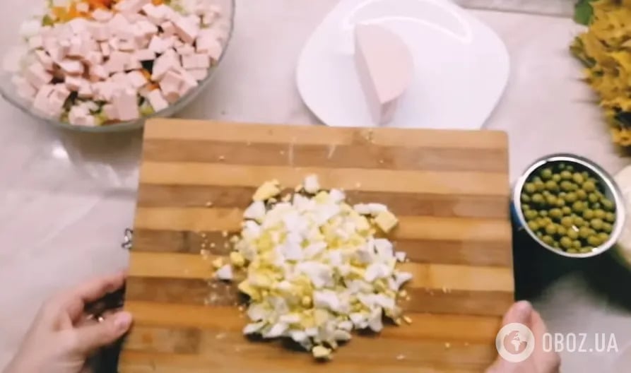 6. Нарезать кубиками два отварных яйца.