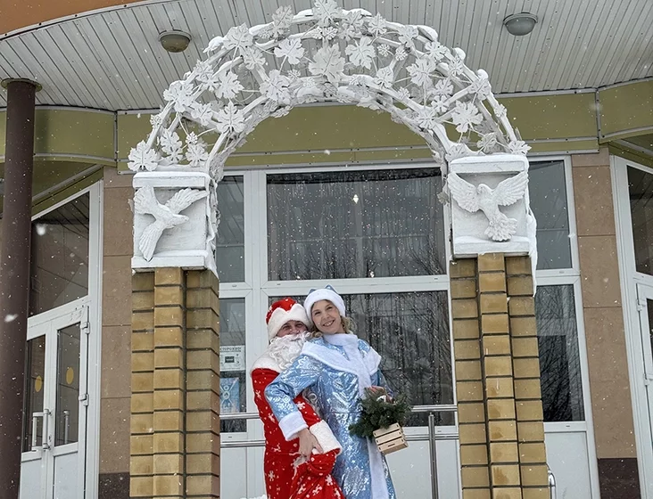 Для праздничной регистрации пара выбрала оригинальные костюмы: у Станислава — красная шуба до пола, у Марины — нежная голубая шубка со снежинками. Даже погода откликнулась на их чувства — снег красиво покрыл город.