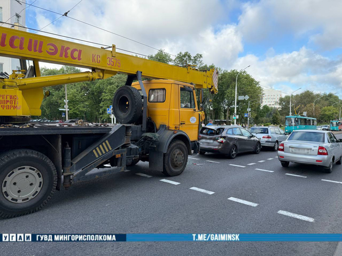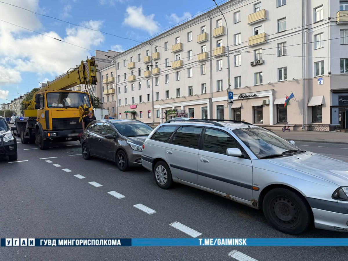Сегодня на улице Долгобродской в Минске случилось ДТП с участием как минимум трех автомобилей. Авария попала на видео: оказалось, что «паровоз» собрал водитель автокрана.