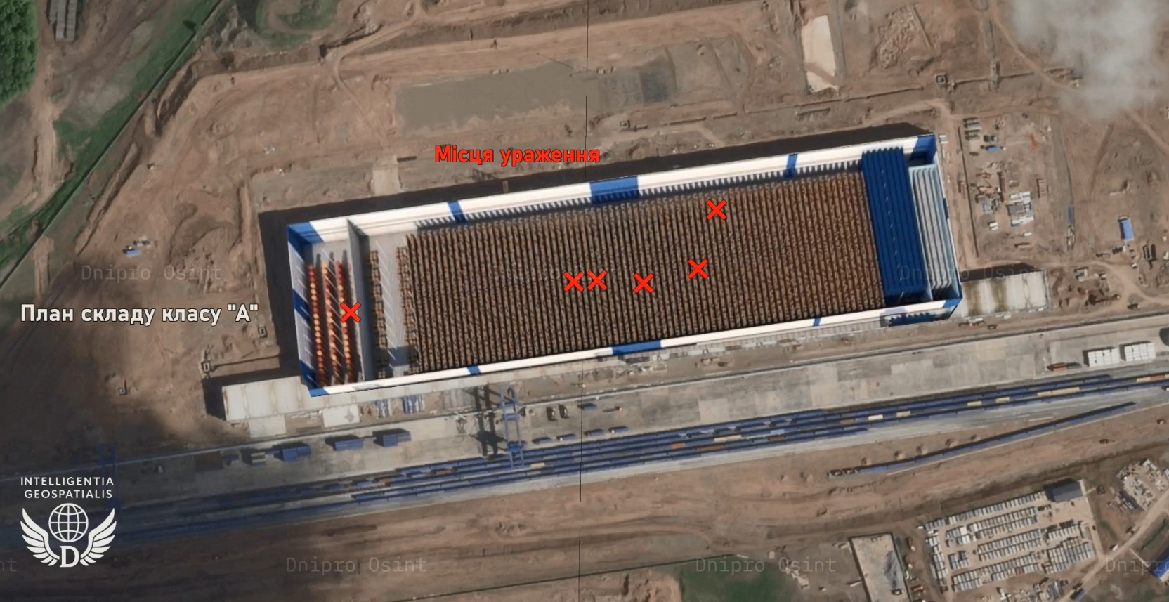 OSINTеры опубликовали три фото логистического хаба им. Дэн Сяопина в Татарстане. На одном из них — схема склада класса «А», на которой шестью крестиками обозначены точки прилетов. На втором фото — крыша с надписью, на которой заметны заплатки.