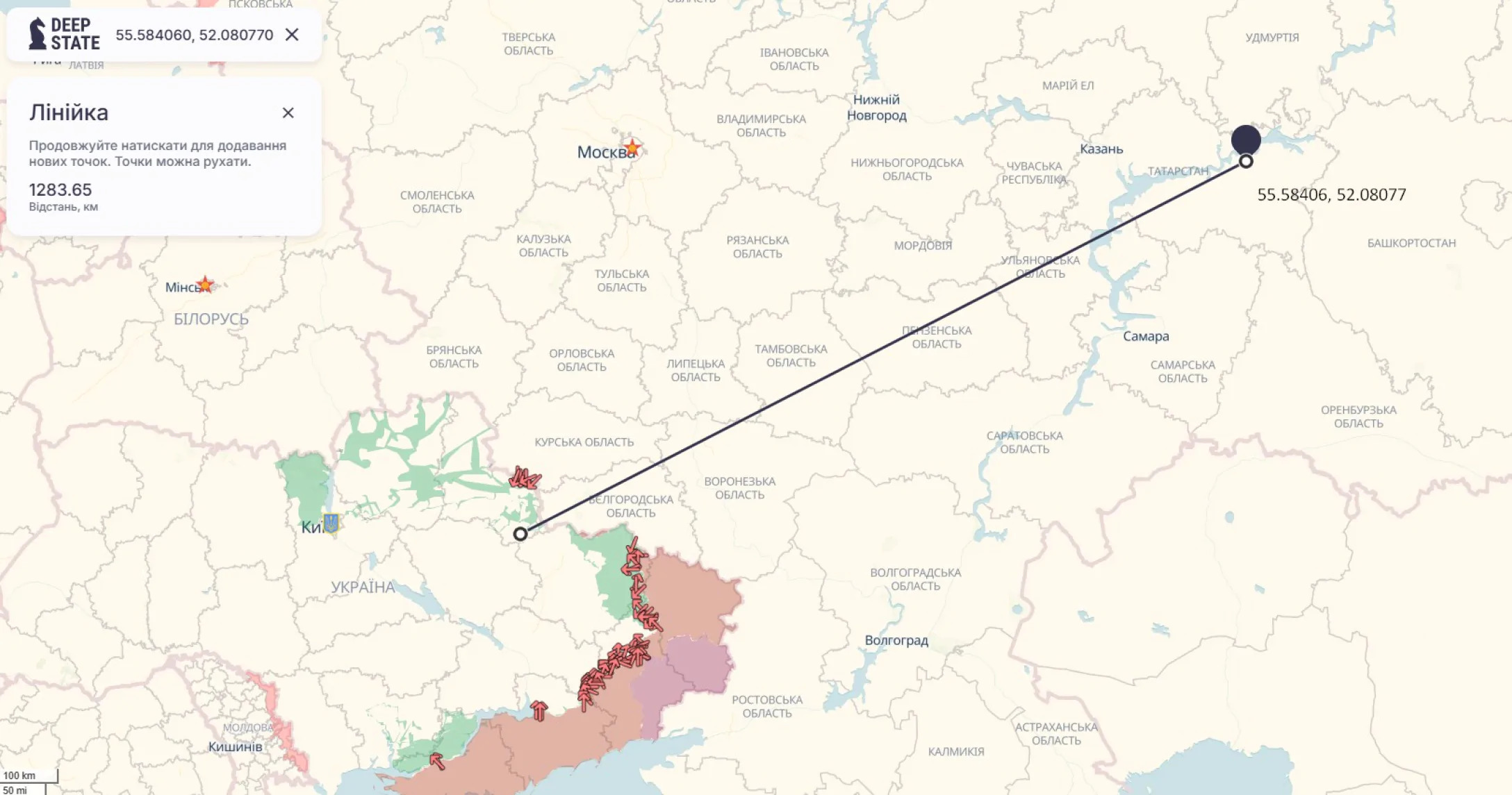 В заметке также указывают точные координаты точки попадания — 55.58406917027638, 52.08077267832528. Если обозначить указанные координаты склада им. Дэн Сяопина на карте, то видим, что расстояние, которое преодолели дроны СБУ, минуя все средства ПВО ВС РФ, — более 1 200 км.