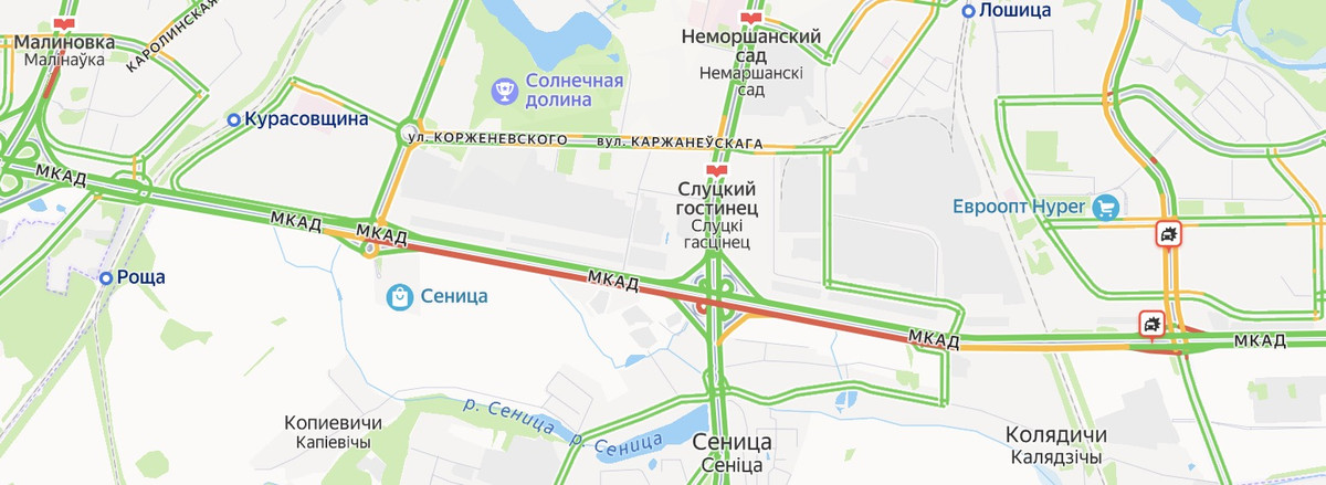 Данные сервиса «Яндекс.Карты» подтверждают, что на внешнем кольце МКАД движение затруднено: хвост пробки к 09:00 дотянулся аж до съезда на улицу Казинца. Впрочем, это не означает, что виной всему изменившаяся схема движения в районе Игуменского тракта и улицы Бабушкина.