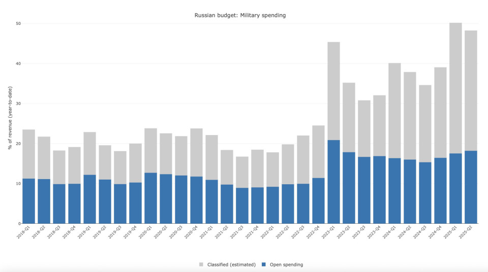 Доля трат на войну в доходах казны в первом квартале 2025 года составила 50,1%, а на конец второго — 48,2%, подсчитал на основании данных системы «Электронный бюджет» научный сотрудник научный сотрудник германского Института проблем международной безопасности Янис Клюге.