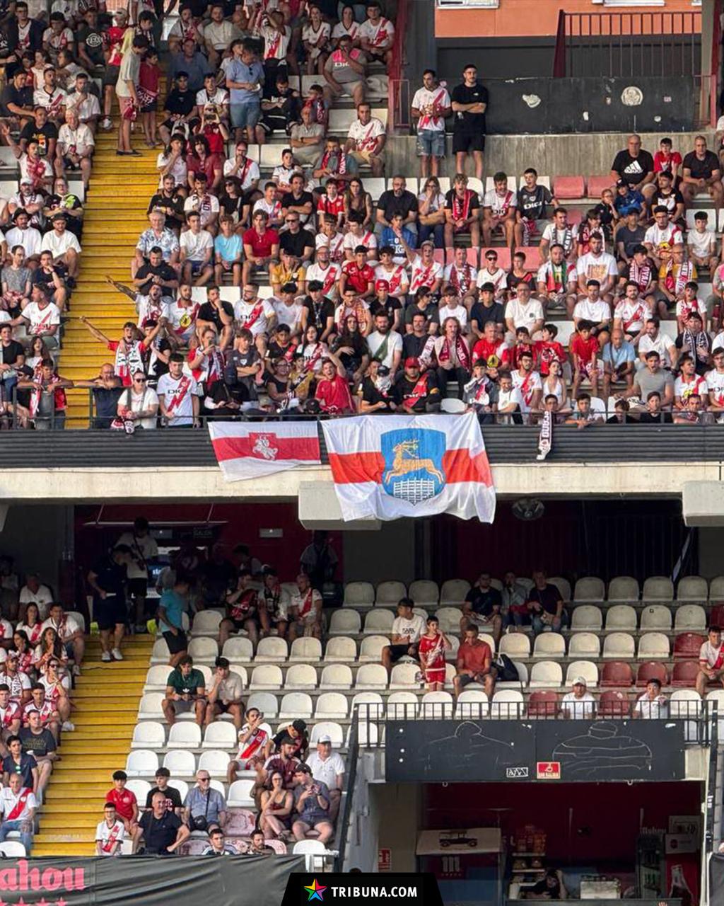 Белорусы с бело-красно-белыми флагами поддерживают «Неман» в матче против «Райо Вальекано»