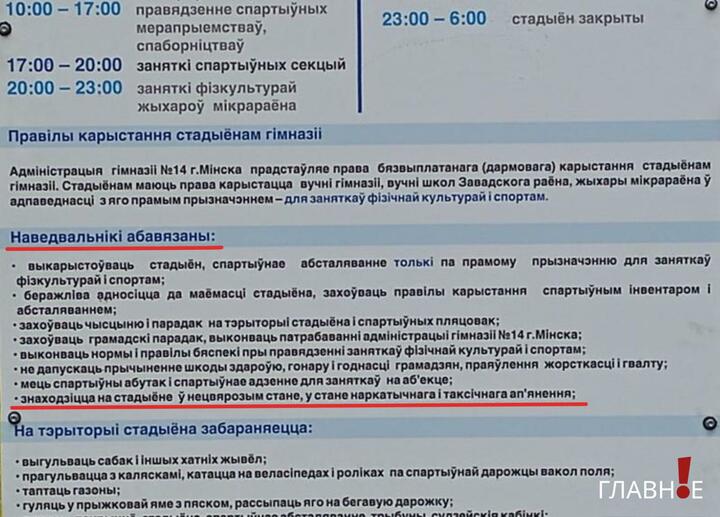 Посетители стадиона гимназии № 14 Минска обязаны находиться «в состоянии алкогольного, наркотического и токсического опьянения». Такую информацию по ошибке разместили на стенде, который установлен возле спортивного объекта учебного заведения, заметил телеграм-канал «Минск. Главное!».