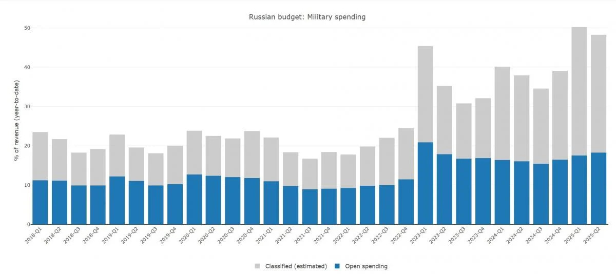 Издание The Moscow Times пишет, что доля расходов на войну в первом квартале текущего года достигла 50,1%, а на конец второго - 48,2%.