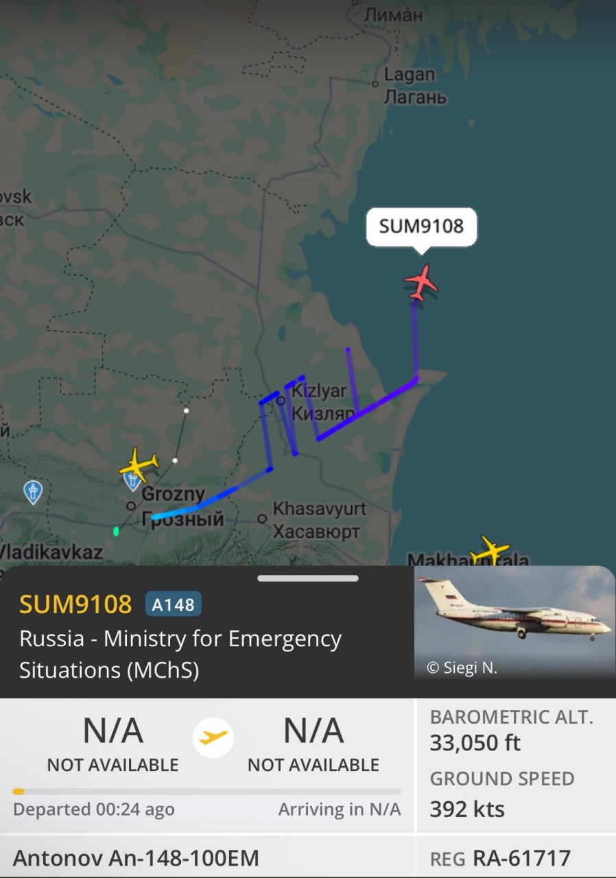 Ан-148-100ЕМ — самолет, используемый МЧС России в качестве «летающего госпиталя», — вылетел из Грозного, следует из данных сервиса Flightradar, на которые обратили внимание «Важные истории». Судно летит через Каспийское море.