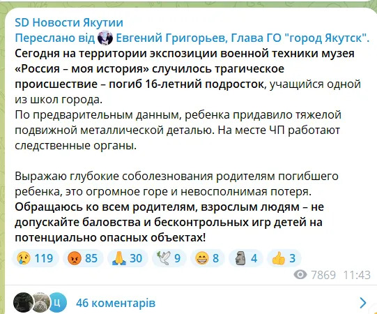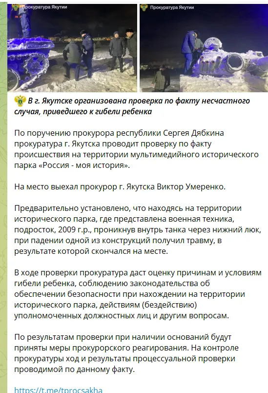 Подростка 2009 года рождения насмерть придавило танком на территории музея «Россия – моя история» в городе Якутск. 16-летний парень решил полюбоваться «экспозицией военной техники», устроенной там с пропагандистской целью.