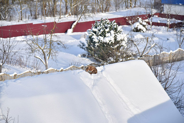 Так, в Глубоком на коньке хозяйственной постройки частного дома обосновалась необычная гостья. Лиса живописно устроилась среди снега, нападавшего на крышу во время обильных снегопадов, и, похоже, не спешит в лес.