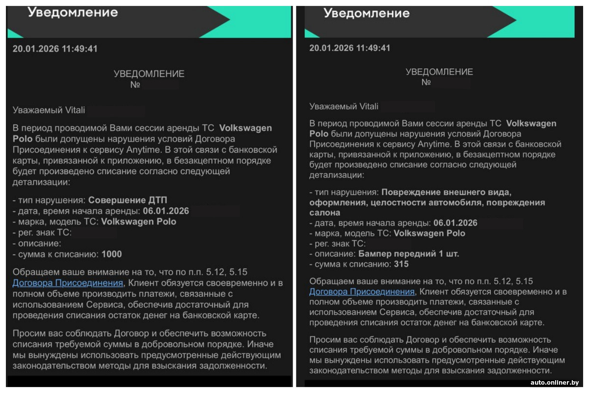 — 6 января я ехал с ребенком домой с мероприятия. Арендовал ближайший автомобиль компании Anytime. Тогда уже было много снега. При бронировании я просмотрел по фото в приложении уже имеющиеся повреждения, обошел авто пару раз и, не обнаружив новых дефектов, решил не фотографировать повторно уже известные, — вспоминает Виталий.