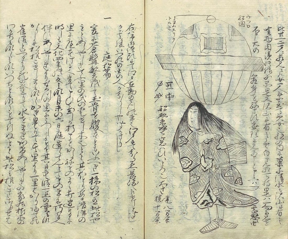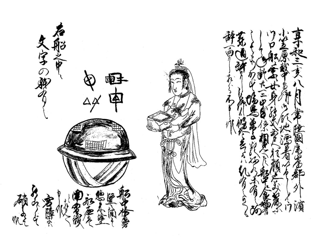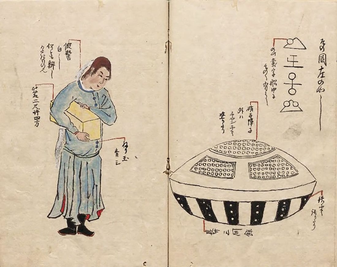 Японские источники того времени могут рассказывать историю по-разному, но есть и общие черты. В них говорится о странном объекте высотой примерно в три метра и шириной более пяти метров. На рисунках он напоминает то юлу, то кекс, то чуть сплющенную по вертикали сферу или казан с крышкой.