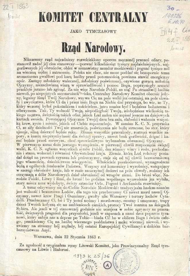 1.Восстание на территории Королевства Польского было объявлено от имени подпольного временного Национального правительства в Варшаве специальным манифестом, датированным 22 января 1863 года. В нем под «святое знамя Орла, Погони и Архангела» призывались жители бывшей Речи Посполитой, уничтоженной в конце XVIII века в результате разделов Австрией, Пруссией и Россией. В манифесте к борьбе за лучшее будущее против «тирана» (императора Александра II) призывался и «московский народ» – «ведь и сам ты бедный и забитый». Манифест составила поэтесса Мария Ильницкая, одна из первых борцов за эмансипацию женщин в Польше.