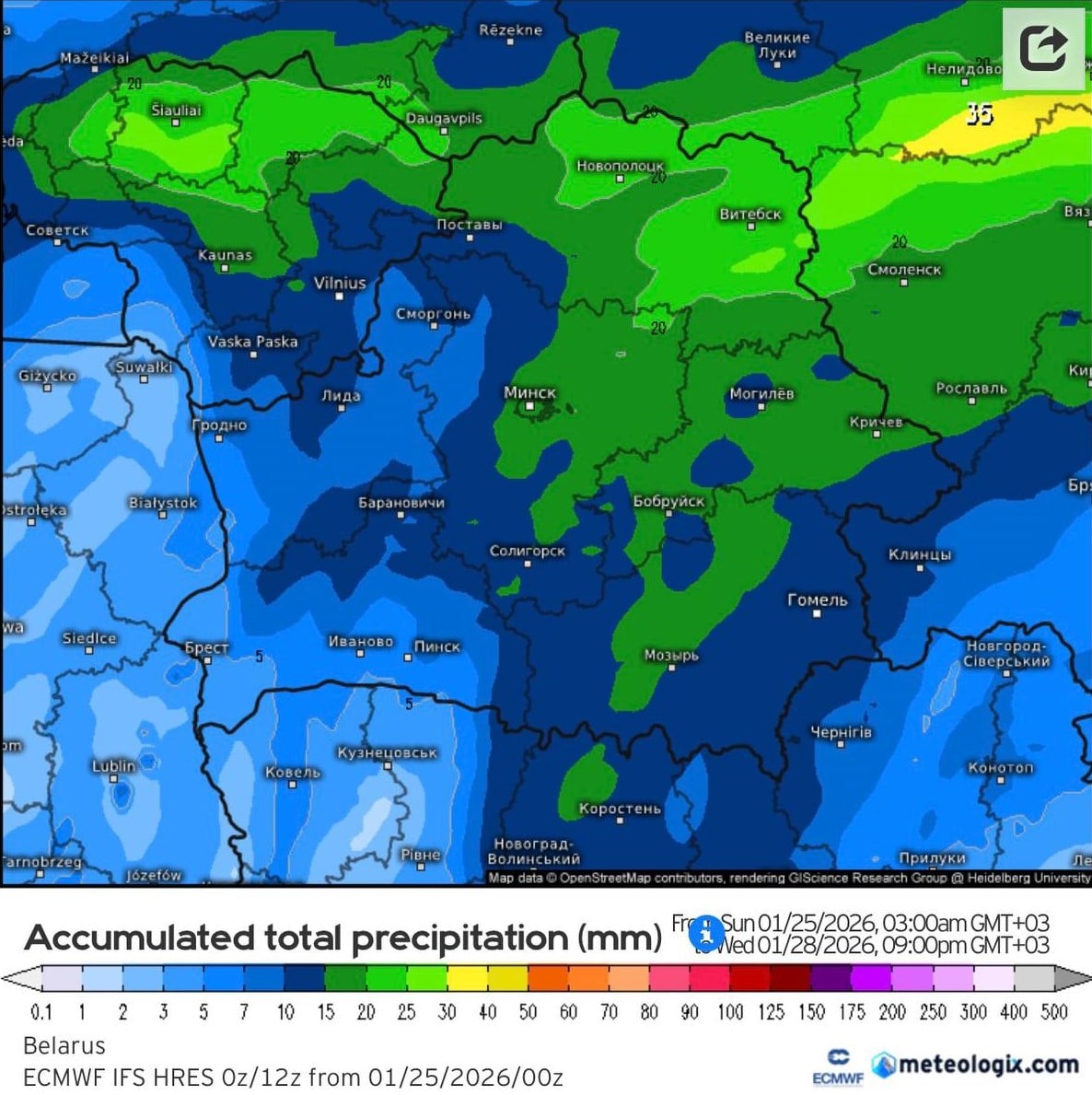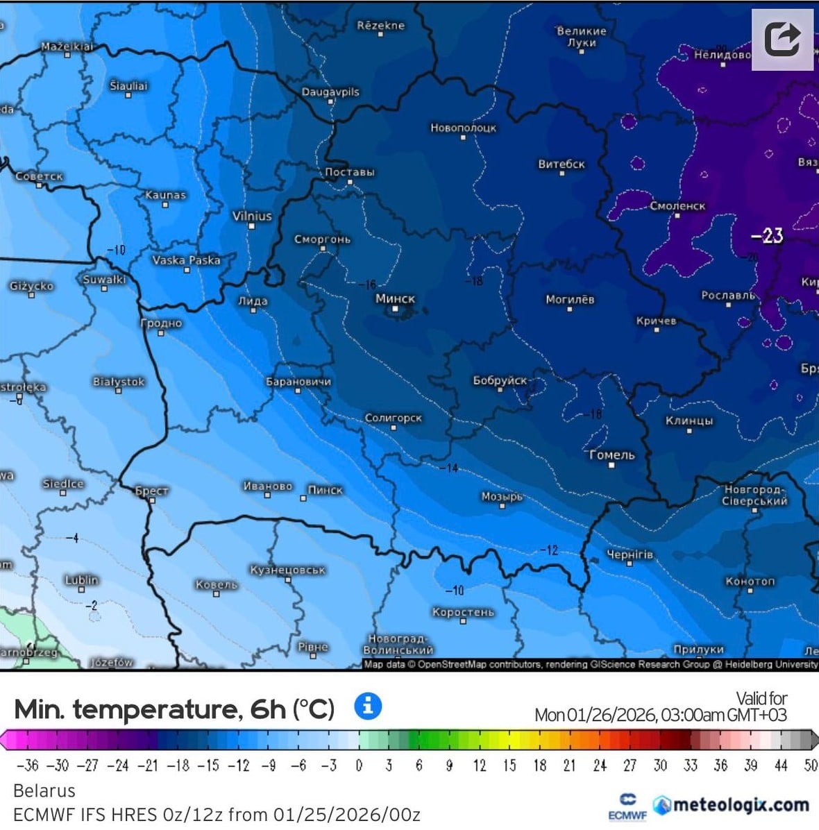 В понедельник, 26 января, с Адриатики на восток Германии выйдет циклон «Леони», который покажет себя и в Беларуси. По данным тематического Telegram-канала «Метеовайб», погода начнет портиться с самого утра. Smartpress.by узнал, чего именно ждать от надвигающейся стихии.