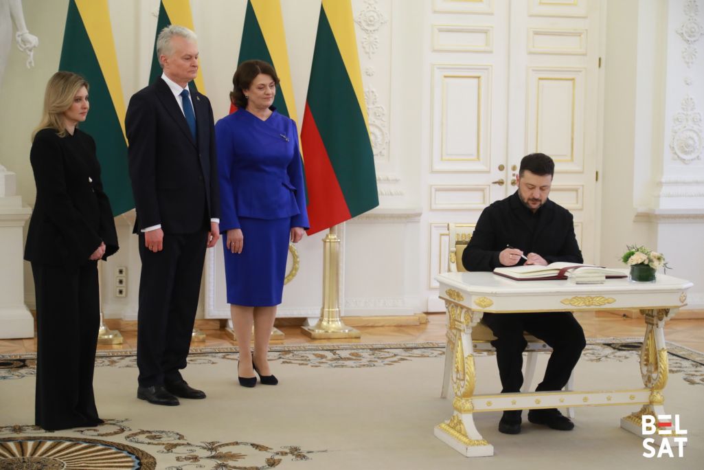Во время официальной церемонии Зеленских приветствовали с почетным караулом и оркестром. Первая пара традиционно расписалась в книге гостей президента Литвы.
