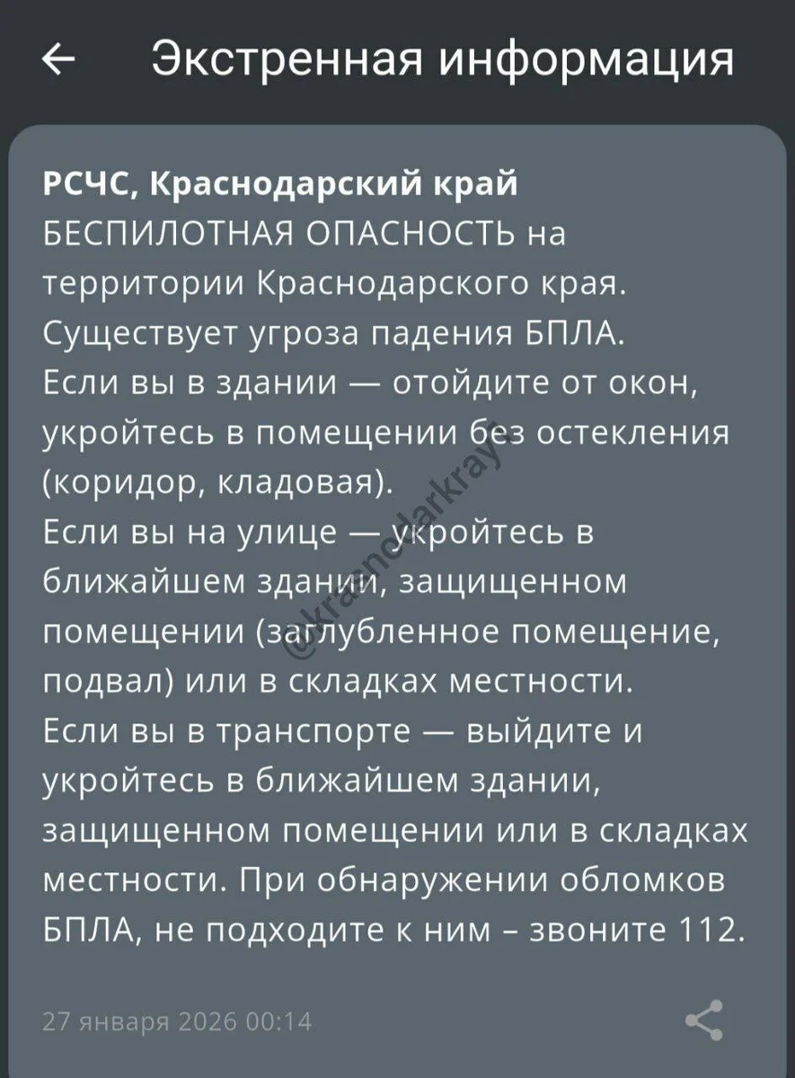 Воздушную тревогу в регионе объявили еще около полуночи. Российские мониторинговые каналы предупреждали о движении дронов курсом на область. «Росавиация» ввела ограничения в аэропорту Краснодара на посадку и вылет самолетов.