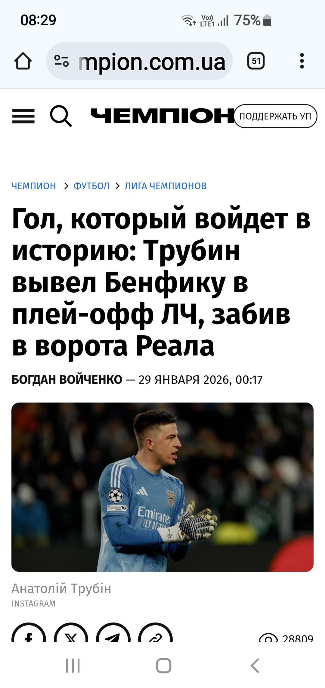 Украинский вратарь «Бенфики» Трубин забил гол «Реалу»