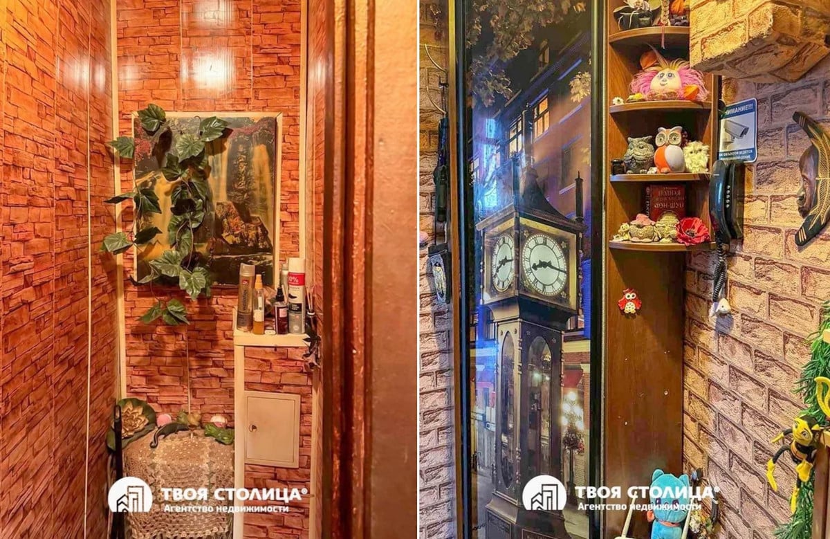 В квартире царит аура евроремонта, когда владельцы не стеснялись и делали все на максимум. Обои в цветочек, имитация кирпичной кладки, шкаф с изображением Биг-Бена, искусственные цветы в санузле — здесь смешалось все и сразу.