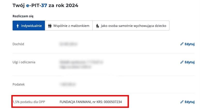 В поле «Numer KRS wybranej organizacji (Poz. 147 z PIT-37)» введите номер 0000507234. Это номер FaniMani — партнерской организации, которая поможет нам получить помощь.