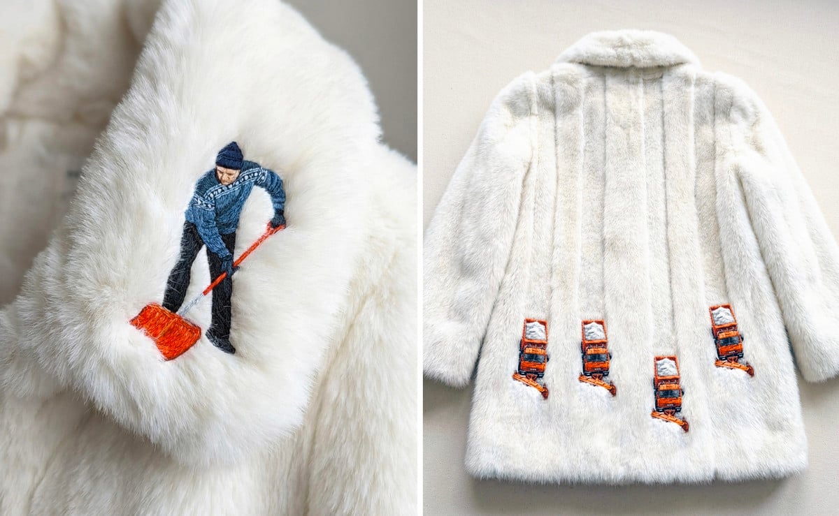 — Сидел у окна, смотрел на снег, вертел в голове идеи. Сначала просто пришел образ оранжевой лопаты — подумал, что будет прикольно разместить ее на белой футболке. Потом уже пришло озарение: это должна быть не футболка, а шуба. Так ее мягкая текстура стала местом для каких-то понятных городских сюжетов: человек с лопатой, сами лопаты, разбросанные на снегу, снегоуборочные автомобили, мотивы с собаками (если приоткрыть некоторые места на шубе, виднеются их какашки), — рассказал Лимонов.