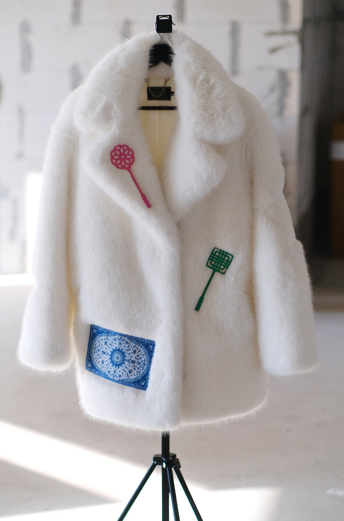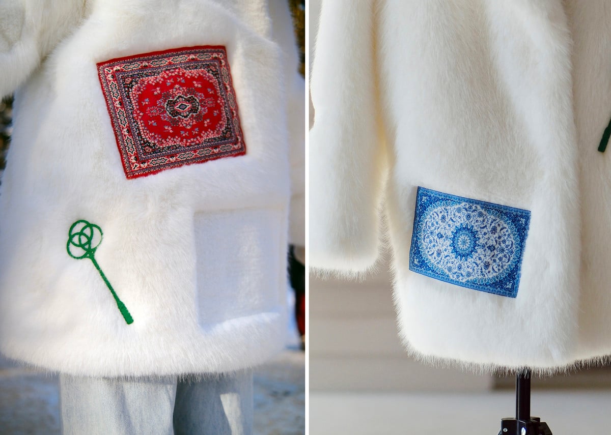 В итоге получилась «снежная» шуба с ностальгическими деталями: советскими коврами и выбивалками. Вероятно, родившиеся позже 2000 года могут даже не понять, к чему отсылает такая композиция, но у людей постарше сейчас, уверены, глухо застучало в голове. В модный slavic core тоже вроде как вписывается идеально.