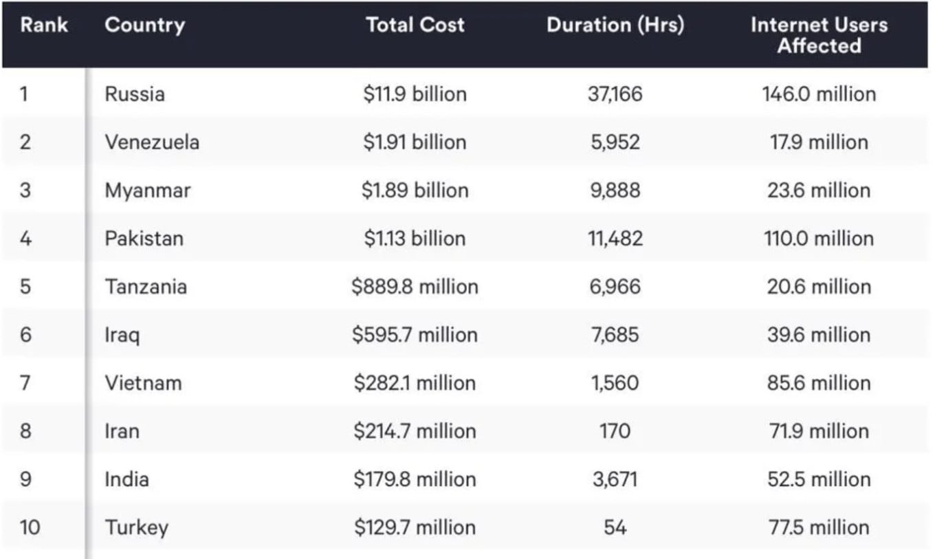 Ущебр российской экономике от «шатдаунов», отключений мобильного интернета, замедления ресурсов и соцсетей, эксперты оценивают в $11,9 млрд за год (930 млрд рублей). Это больше, чем у всех остальных стран из рейтинга вместе взятых ($7,8 млрд).