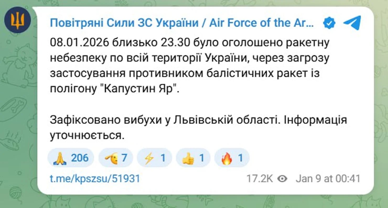 «08.01.2026 около 23.30 было объявлено ракетную опасность по всей территории Украины, из-за угрозы применения противником баллистических ракет с полигона «Капустин Яр». Зафиксированы взрывы во Львовской области. Информация уточняется», — отметили в ВС ВСУ.