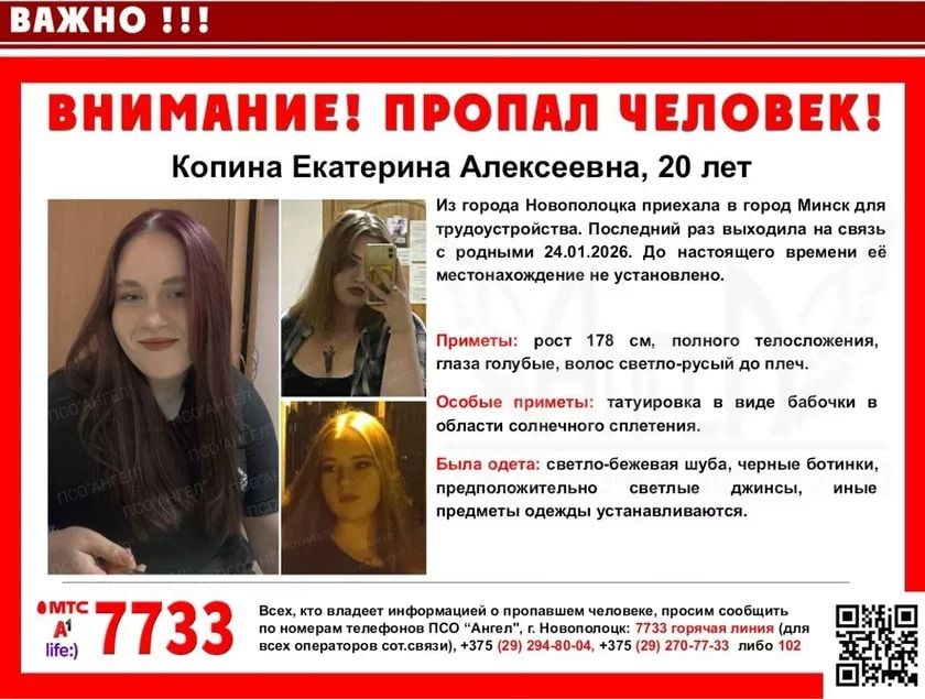 Всех, кто располагает какой-либо информацией о возможном местонахождении Екатерины Копиной, просят сообщить в поисково-спасательный отряд «Ангел» по номеру 7733 (для всех операторов), по телефонам +375 29 294-80-04, +375 29 270-77-33 либо по номеру 102.